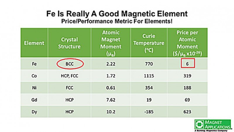 First, it terms out the iron is an excellent magnetic element. Here I'm comparing the ferromagnetic transition elements plus a couple of REE's. First column shows the crystal structure of the element. Next, I'm comparing the atomic magnetic moments of the elements i.e. magnetization at the atomic level. The atomic magnetic moments are based on the fundamental units of magnetization known as the Bohr Magnetron. A Bohr Magnetron is the magnetic moment of an electron caused by the orbital or spin angular momentum of the electron. Interesting to note that the 2 REE's have the highest moments but unfortunately very low Tc's. I then tool the current price of each element per kg and using the atomic weights and calculated the price per atom. Then analogous to my magnet price performance metric I divided price per atom by the atomic magnetic moment and arrived at price per atomic magnetic moment. And by far the most efficient element is Fe. Of course, the metallurgists and materials scientists and even physicists must find suitable alloying elements to convert the BCC crystal structure to something uniaxial and hopefully with a significant Ha!